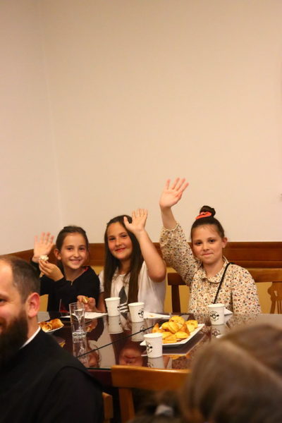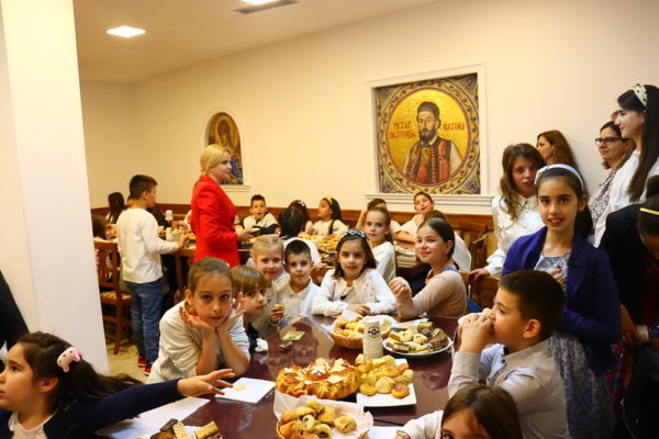 Након бесједе оца Мирчете ученици су извели и кратак програм који се састојао од лијепог хорског појања које је водила вјероучитељица Ана Ненадић, али и пјесама које је писао ученик Огњен Андрић за ову прилику. Заједничарење је настављено за трпезом љубави коју су припремили родитељи ученика у Његошевој сали Саборног храма, гдје се наставило са пјесмом у славу Бога и Светог Николаја српског а на којој је ученике поздравио и Предсједник Ц.О. Подгорица Радош Лоло Кастратовић.