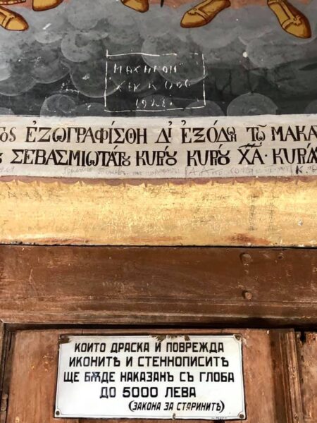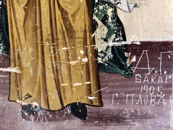 За съжаление върху стенописите в храма „Св. Архангели“ своя отпечатък не е оставило само времето, а и поколения българи, които са изписали върху светите образи имената си, дати, населени места, прякори. В този случай не можем да търсим вината у турците по време на рабството, за което съдим по езика на писане и датите, не можем да съдим и комунистическия режим, защото ако бяха властимащите от другарското време, то стенописите можеше и да не останат до днес. Виновни сме всички ние, нашето възпитание като човеци и невъзпитанието ни в страх Божий.