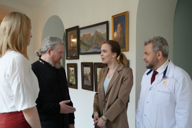 7 мая в церковной Больнице Святителя Алексия открылась выставка Академии акварели и изящных искусств Сергея Андрияки «Сестры Андрияки. Преемственность поколений». На ней представлены работы молодых художниц Елизаветы, Софьи и Марии Андрияки. Центром экспозиции стала картина народного художника России Сергея Андрияки, на которой изображена Больница Святителя Алексия в зимнее время года. Мастер написал полотно в 2023 году ко дню 120-летия Больницы. Председатель Синодального отдела по благотворительности, заместитель Председателя Попечительского Совета Больницы Святителя Алексия епископ Верейский Пантелеимон после совершения Литургии в больничном храме посетил выставку и поздравил молодых художниц с праздником Пасхи.