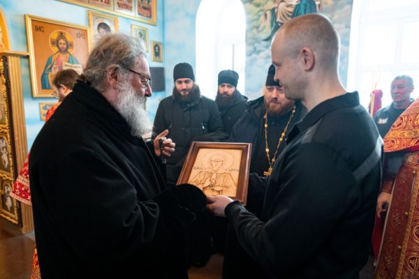 Владыка Кирилл вручил молившимся за богослужением заключённым сладкие подарки. Отбывающие наказание поблагодарили архипастыря за богослужение и преподнесли в дар Его Высокопреосвященству икону блаженной Матроны Московской ручной работы.