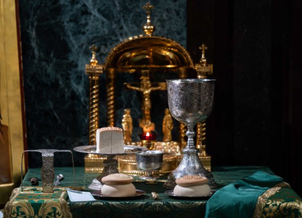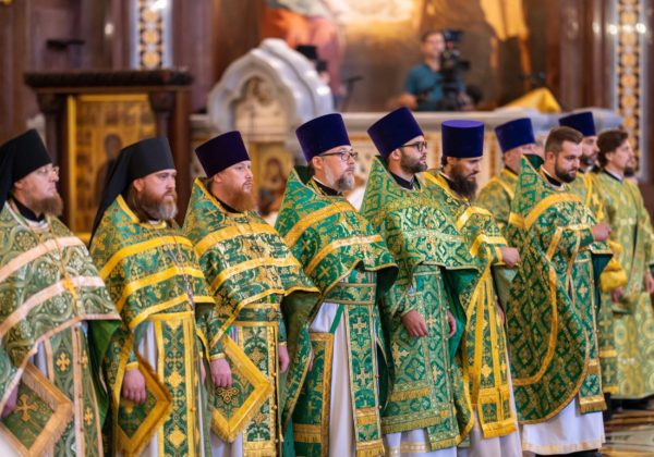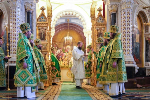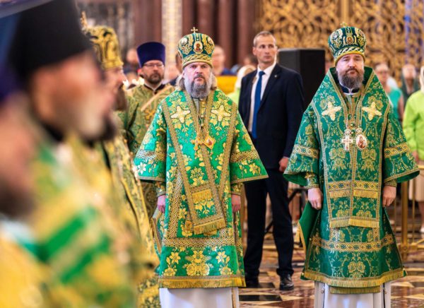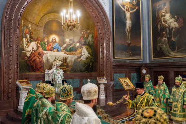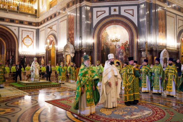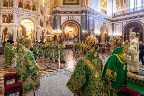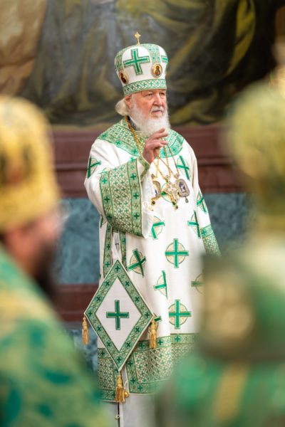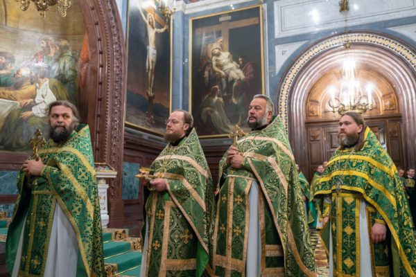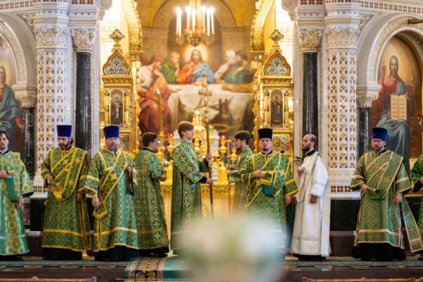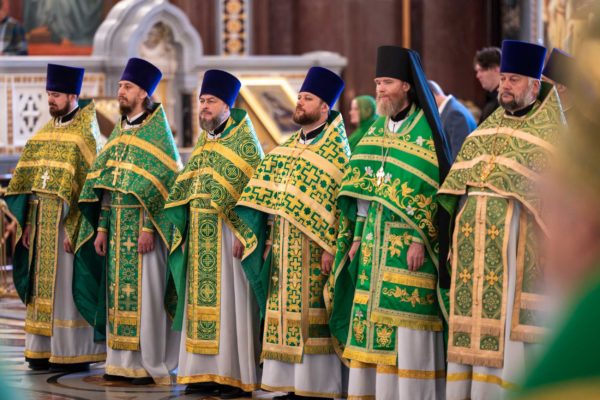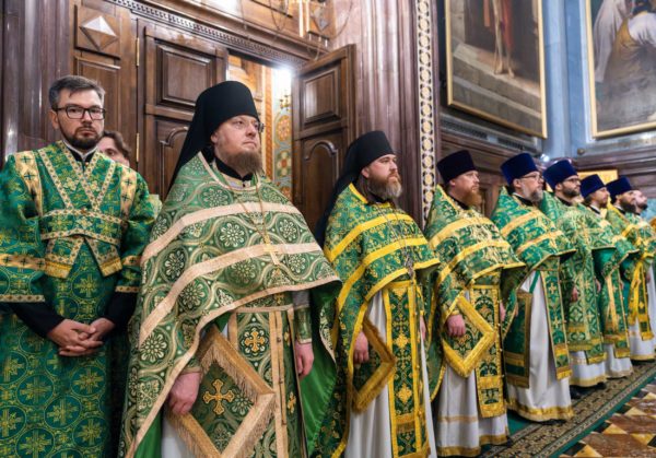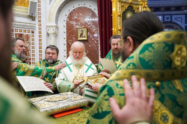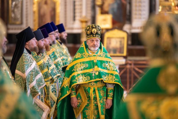 За Литургией Его Святейшеству сослужили: митрополит Воскресенский Григорий, управляющий делами Московской Патриархии, первый викарий Патриарха Московского и всея Руси по г. Москве; митрополит Красноярский и Ачинский Пантелеимон; митрополит Тверской и Кашинский Амвросий, председатель Синодальной богослужебной комиссии; архиепископ Псковский и Порховский Матфей; епископ Норильский и Туруханский Агафангел; епископ Енисейский и Лесосибирский Игнатий; епископ Раменский Алексий, личный секретарь Святейшего Патриарха Кирилла; епископ Минусинский и Курагинский Серафим; протопресвитер Владимир Диваков, секретарь Патриарха Московского и всея Руси по г. Москве; протоиерей Михаил Рязанцев, ключарь Храма Христа Спасителя; игумен Дионисий (Шленов), наместник Андреевского ставропигиального монастыря; игумен Иннокентий (Нилов), секретарь Красноярской епархии, благочинный церквей Левобережного городского округа Красноярска, наместник красноярского Успенского мужского монастыря; протоиерей Владимир Дорош, руководитель Административного секретариата Красноярской епархии, настоятель Покровского кафедрального собора г. Красноярска; иеромонах Герман (Мельников), секретарь Норильской епархии, настоятель кафедрального собора в честь иконы Божией Матери «Всех скорбящих Радость» г. Норильска; иеромонах Мисаил (Сарафанов), помощник управляющего делами Московской Патриархии; иерей Роман Богдасаров, заведующий сектором по взаимоотношениям с Федеральной службой войск Национальной гвардии Синодального отдела по взаимодействию с Вооруженными силами и правоохранительными органами, настоятель храма преподобных Зосимы и Савватия Соловецких в Гольянове г. Москвы; духовенство г. Москвы.