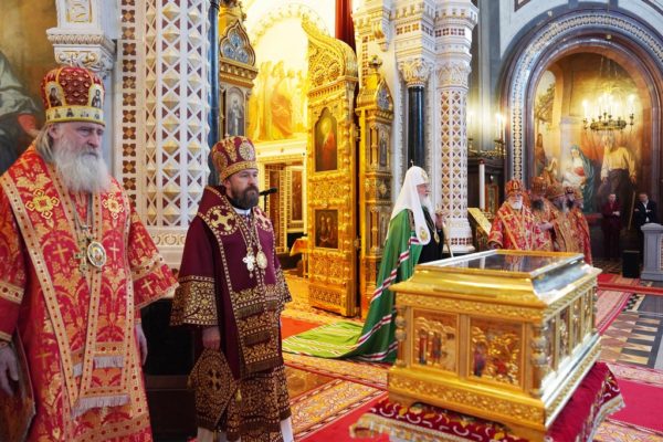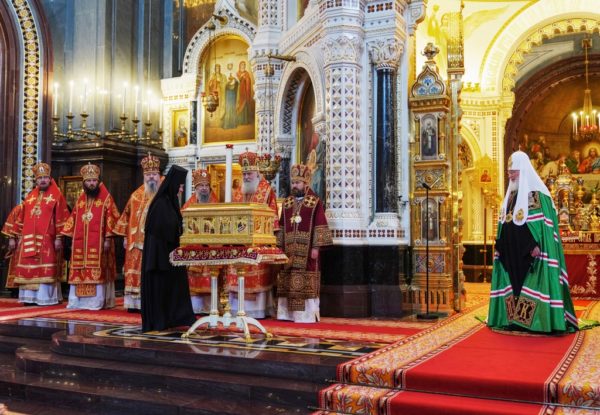 В завершение Святейший Патриарх Кирилл передал настоятельнице Воскресенского Новодевичьего монастыря Санкт-Петербурга игумении Софии (Силиной) ковчег с мощами святителя и чудотворца Николая.