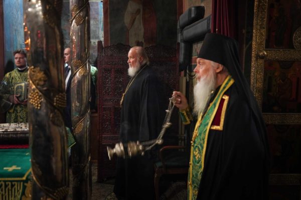 Его Святейшеству сослужили: Патриарший экзарх всея Беларуси митрополит Минский и Заславский Вениамин; руководитель Административного секретариата Московской Патриархии архиепископ Одинцовский и Красногорский Фома; наместник Троице-Сергиевой лавры, ректор Московской духовной академии епископ Сергиево-Посадский и Дмитровский Кирилл; личный секретарь Святейшего Патриарха Кирилла епископ Раменский Алексий; насельники Троице-Сергиевой лавры архимандрит Макарий (Веретенников) и архимандрит Иеремия (Соловьев); сонм духовенства.