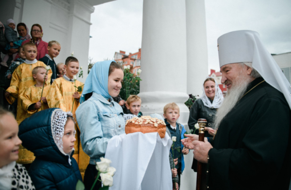 Перед началом богослужения у входа в храм архипастыря приветствовали учащиеся приходской воскресной школы.