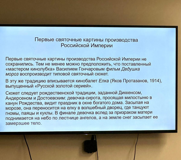 В лекции были прослежены особенности киножанра святочного фильма, отсылавшего зрителей к популярным на Руси рождественским театральным постановкам и вертепным представлениям. Прихожанам показали фрагменты из созданных в начале XX века фильмов на тему Рождества Христова.