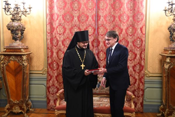 Заместитель министра иностранных дел Е.С. Иванов вручил секретарю ОВЦС по межхристианским отношениям иеромонаху Стефану (Игумнову) нагрудный знак МИД России «За взаимодействие».
