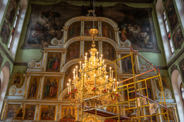 Темная окраска стен и сводов в сочетании с высотой и объемом придает храму строгость и глубину. Главный иконостас относится к середине XVIII века, стенопись — к середине XIX века. Старые иконы в иконостасе записаны новыми образами.