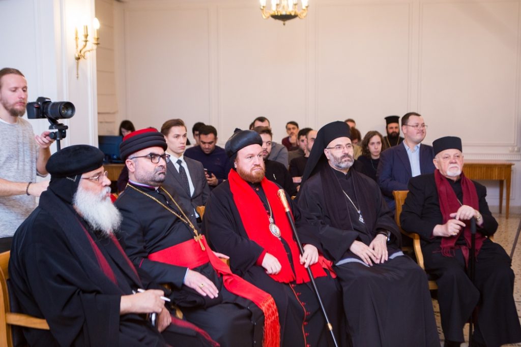В заседании круглого стола приняла участие делегация членов Совета христианских лидеров Ирака, находящаяся с визитом в Москве: генеральный секретарь Совета лидеров христианских Церквей Ирака архиепископ Ирака (Армянская Апостольская Церковь) Авак Асадурян, митрополит Багдадский и Кувейтский Гаттаз Хазим (Антиохийская Православная Церковь), архиепископ Мосула, Киркука и Курдского автономного района Мар Никодим Дауд Шараф (Сирийская Ортодоксальная Церковь), епископ Эрбиля Мар Абрис Юханна Тйари (Ассирийская Церковь Востока), протопресвитер Сами Юнан Альфред Ибрагим (Антиохийская Православная Церковь), представитель Коптской Церкви в Ираке игумен Мина аль-Оршалеми. Участниками встречи также стали: 1-й секретарь Посольства Республики Ирак в Российской Федерации д-р Хайдар Альбурайхи представитель Высшего религиозного марджеи-таглида имама Сейида Али Систани в Российской Федерации и Азербайджане шейх Мухаммад аль-Мосули, представитель Ассирийской Церкви Востока в России, настоятель храма Мат Мариам в Москве хорепископ Самано Одишо, секретарь ОВЦС по межхристианским отношениям иеромонах Стефан (Игумнов), проректор по развитию ОЦАД иеромонах Иоанн (Копейкин), сотрудники ОВЦС и Посольства Ирака в России, представители российской иракской диаспоры, студенты Общецерковной аспирантуры и докторантуры.
