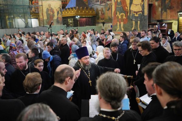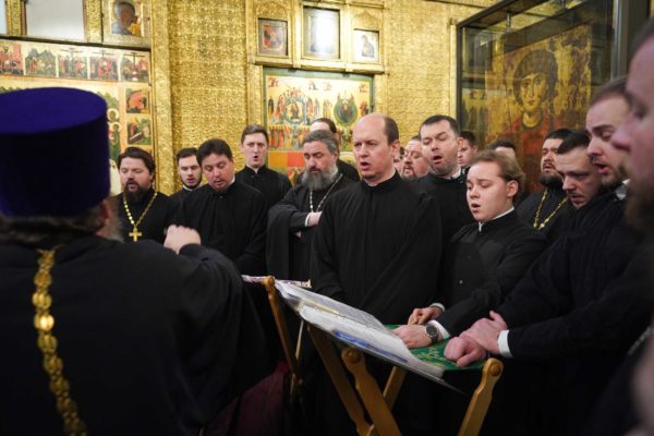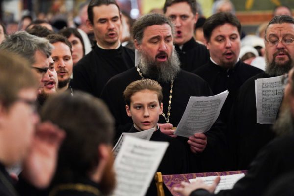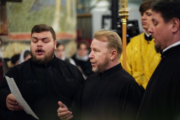 Богослужебные песнопения исполнили хор духовенства Московской митрополии под управлением священника Сергия Голева и солисты хора духовенства Екатеринбургской митрополии.