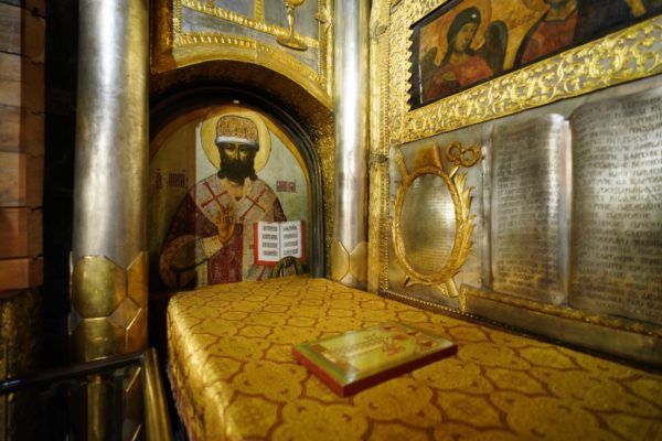 По прибытии в собор Предстоятель Русской Православной Церкви поклонился честным мощам святителя Филиппа, почивающим в раке на правой стороне солеи.