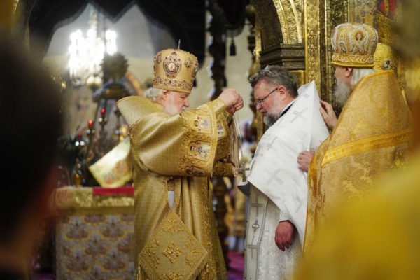 За Литургией Святейший Владыка рукоположил клирика Патриаршего подворья храма святого апостола Андрея Первозванного в Метрогородке диакона Михаила Зуева в сан пресвитера.