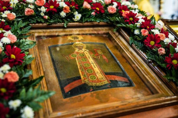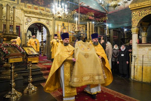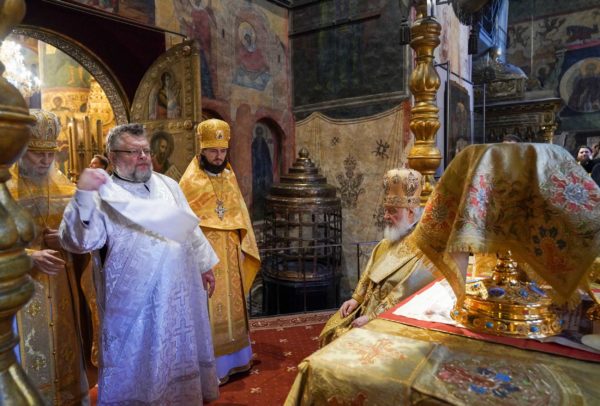 По окончании Литургии Святейший Патриарх Кирилл совершил славление и прочитал молитву у мощей святителя Филиппа.