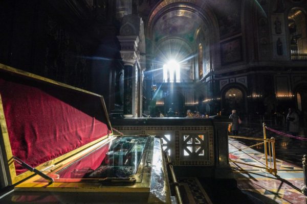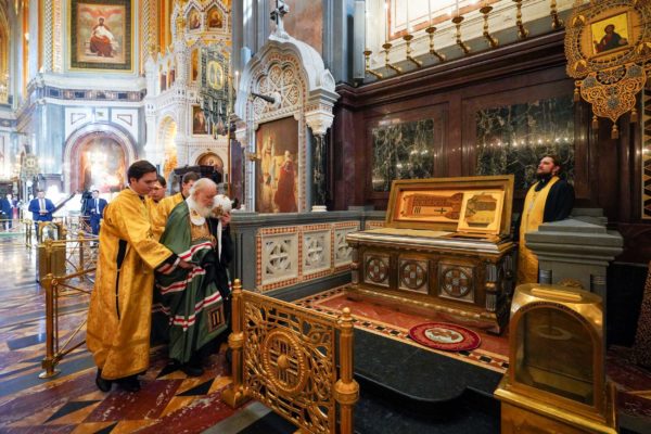 По прибытии в Храм Христа Спасителя Предстоятель Русской Православной Церкви поклонился честным мощам святителя Филарета, митрополита Московского.