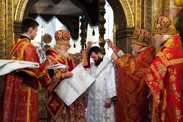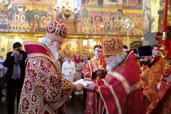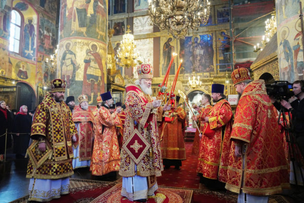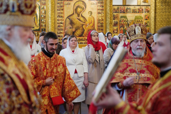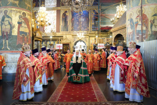 Затем состоялся крестный ход, по окончании которого с солеи Успенского собора Предстоятель Русской Православной Церкви обратился к пастве с Первосвятительским словом.
