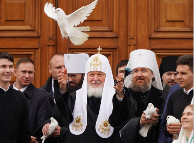 По традиции после богослужения в праздник Благовещения Святейший Патриарх Кирилл вместе участниками молодежного движения «Патриаршие добровольцы» и благочестивыми верующими выпустил в небо голубей со ступеней Благовещенского собора.