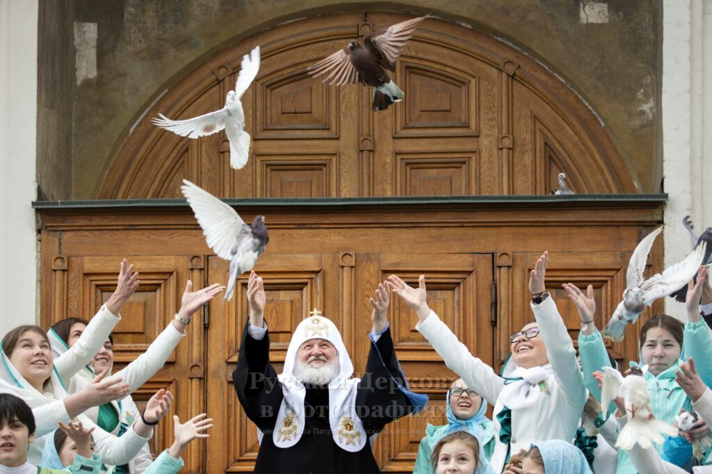 По древней традиции в праздник Благовещения после богослужения Святейший Владыка вместе с воспитанницами приюта при Покровском ставропигиальном монастыре выпустил в небо голубей со ступеней Благовещенского собора.
