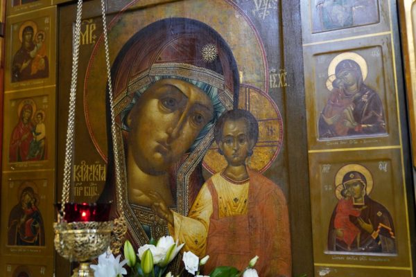 По окончании Литургии Святейший Патриарх Кирилл совершил славление и молитву Пресвятой Богородице перед списком Казанской иконы Божией Матери.