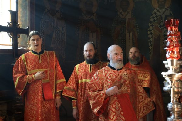 Его Высокопреосвященству сослужила братия обители в священном сане.