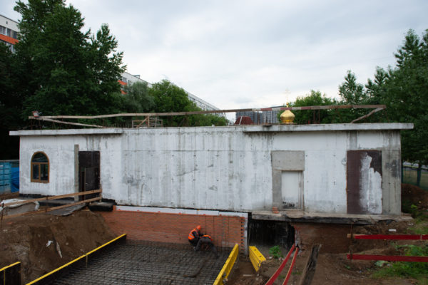 Напомним, храм и приходские помещения здесь запроектированы в едином объеме. В 2016-2018 годах были возведены подземный и цокольный этажи комплекса. После этого работы были приостановлены в связи с отсутствием средств. В 2021 году Концерн «КРОСТ» выразил готовность поддержать стройку и взять на себя функции благотворителя и подрядчика.
