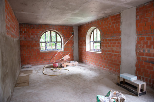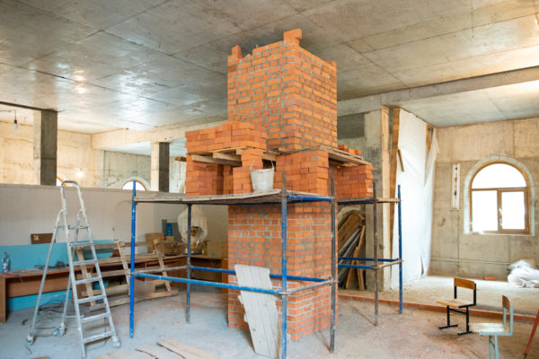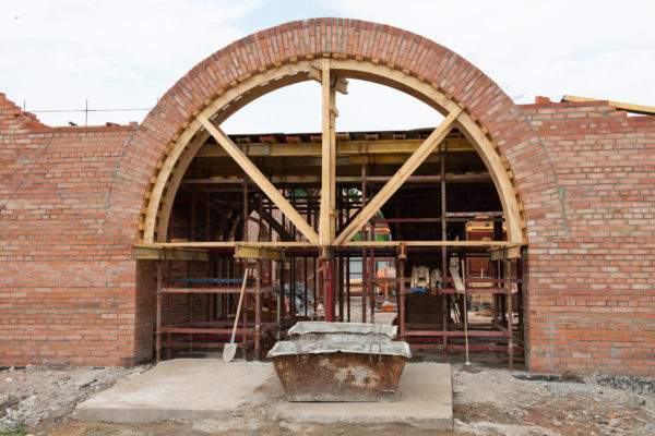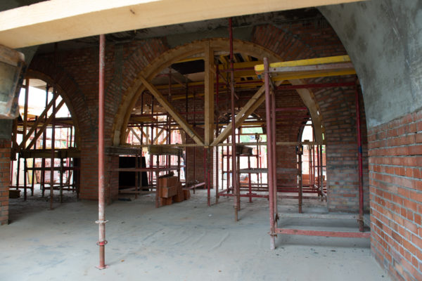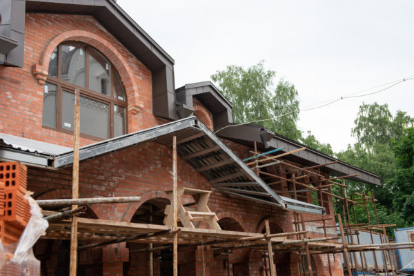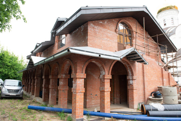 Здание приходского дома также возведено, кровля смонтирована (кроме металлического покрытия над галереей). Окна все установлены. Контур закрыт.