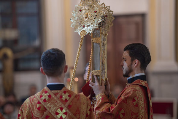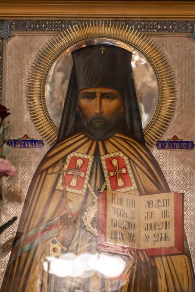 По заамвонной молитве у мощей священномученика Фаддея было совершено славление, митрополит Амвросий прочитал молитву святому.