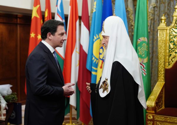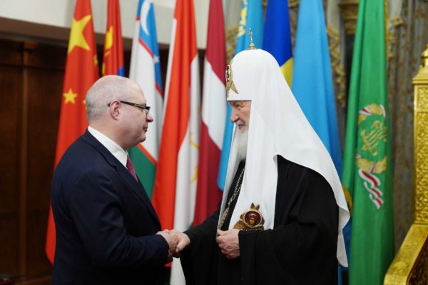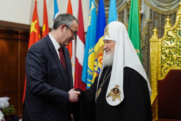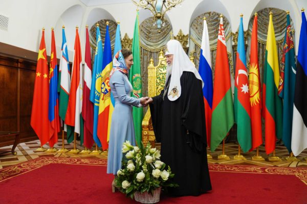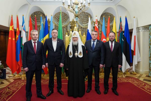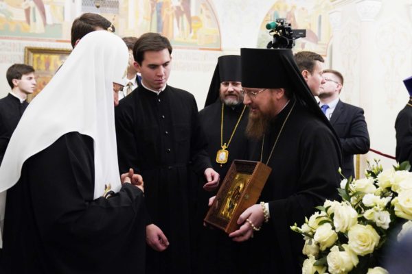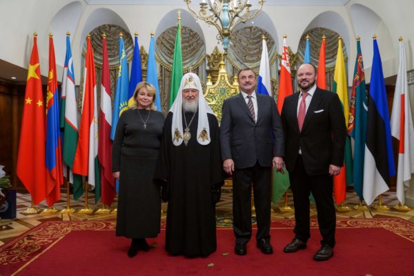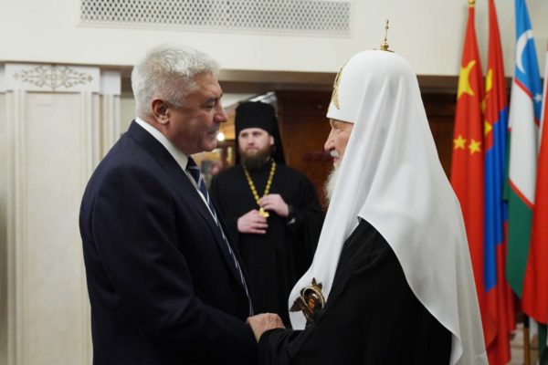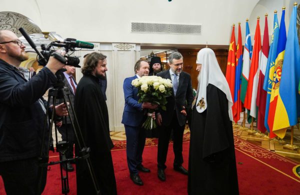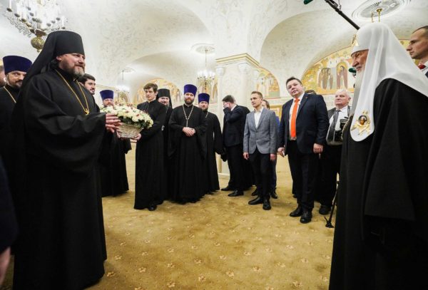 Перед началом приема в Тронном зале Патриарших покоев Предстоятель Русской Православной Церкви принял поздравления от представителей государственных и общественных структур, предпринимателей, сотрудников Московской Патриархии. Святейшего Владыку поздравили: заместитель председателя Государственной Думы ФС РФ А.Ю. Кузнецова; министр внутренних дел Российской Федерации генерал полиции В.А. Колокольцев; государственный секретарь Союзного государства России и Белоруссии Д.Ф. Мезенцев; председатель Комитета Государственной Думы ФС РФ по собственности, земельным и имущественным отношениям, президент Межпарламентской ассамблеи Православия С.А. Гаврилов; председатель Комитета по обороне Государственной Думы ФС РФ А.В. Картаполов; председатель Комитета Государственной Думы ФС РФ по строительству и жилищно-коммунальному хозяйству С.А. Пахомов; депутат Государственной Думы ФС РФ, советник мэра г. Москвы, советник Патриарха Московского и всея Руси по вопросам строительства, куратор Программы строительства православных храмов в г. Москве В.И. Ресин; руководитель Роспотребнадзора А.Ю. Попова; председатель Синодального отдела по взаимоотношениям Церкви с обществом и СМИ, временно исполняющий обязанности руководителя Пресс-службы Патриарха Московского и всея Руси В.Р. Легойда; и.о. генерального директора предприятия «Софрино» А.В. Потемкин; председатель Московской городской Думы А.В. Шапошников; старший вице-президент, финансовый директор ПАО «ГМК “Норильский никель”» С.Г. Малышев; президент Российской ассоциации производителей минеральных удобрений, член бюро РСПП А.А. Гурьев; вице-президент Российского союза химиков А.Г. Гурьев; председатель Наблюдательного совета Общероссийского общественного движения «Россия Православная» М.М. Иванов; заместитель главы Всемирного русского народного собора, председатель Попечительского совета Благотворительного фонда святителя Василия Великого К.В. Малофеев; член Общественной палаты РФ, руководитель секретариата ВРНС С.Ю. Рудов; сотрудники Пресс-службы Патриарха Московского и всея Руси и другие.