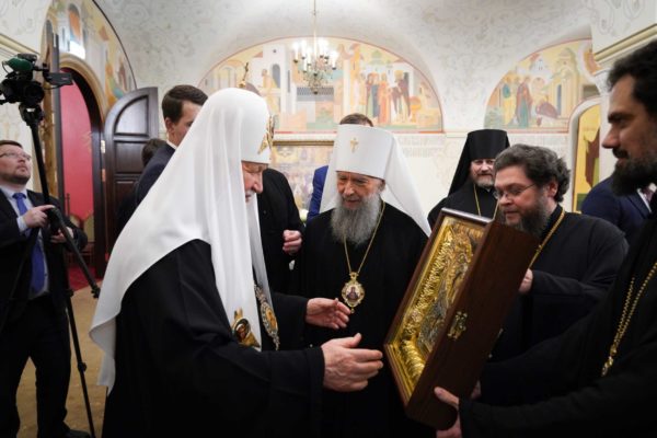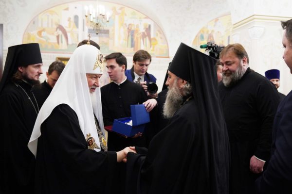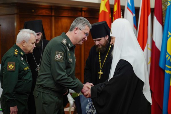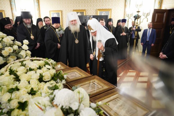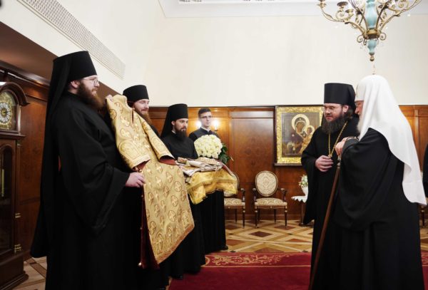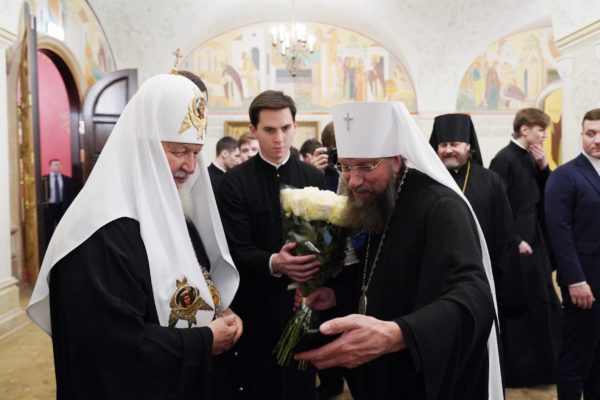 Митрополит Каширский Феогност поздравил Святейшего Владыку от лица Московской епархии и подарил Его Святейшеству литографии XIX века с сюжетами на библейские темы, а также передал бронежилеты и каски для священников, несущих пастырское служение в зоне СВО.