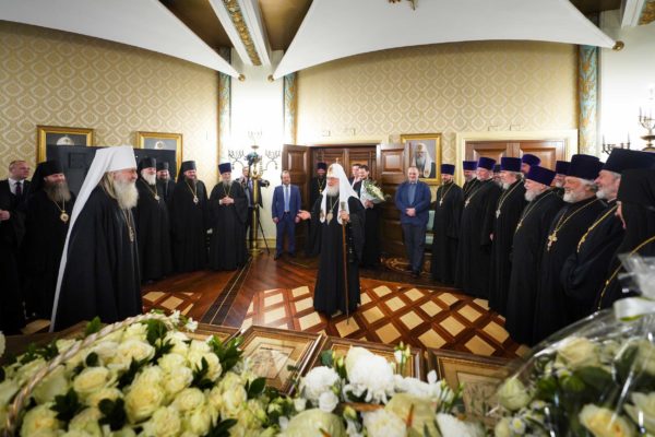 По окончании приема в зале Высшего Церковного Совета Святейшего Владыку поздравили архиереи — викарии Его Святейшества и управляющие столичными викариатствами и духовенство г. Москвы.