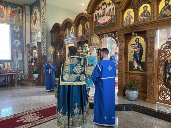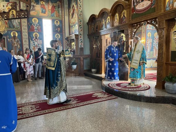После читања светог Јеванђеља о винограду и виноградарима надахнуто је беседио епископ Иринеј. Преломљен је славски колач кума славе г. Немање Карамана. Надлежни парох Борис Чоловић је заблагодарио епископу Иринеју на издвојеном времену, труду и љубави да дође у парохијску заједницу у Гринзбороу, као и чланицама Кола српских сестара, нагласивши њихов велики значај од оснивања парохије до данас: