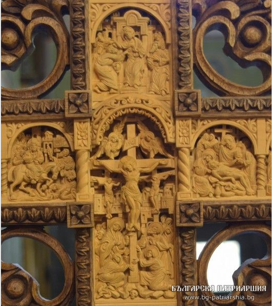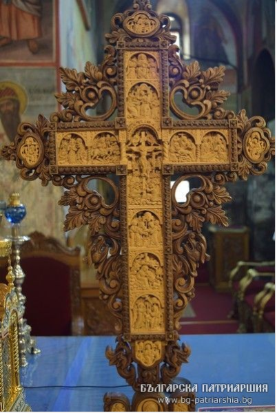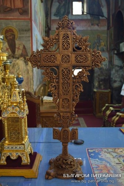 Дърворезбеният напрестолен кръст, също подарен на обителта, е работа на резбаря Пламен Динков от София. Година и половина е отнело на майстора да направи украсения с миниатюрна дърворезба кръст. Изпълнен е в традициите на българската възрожденска дърворезба, от чимширово дърво – самите сцени, а от орех – стойката и обрамчващата част. Кръстът и с размери 85х43см, изрязани са сцените: Неверието на Тома, Кръщение Христово, Вход Господен в Иерусалим, Разпятие Христово (в средата), Оплакване, Жените мироносци при Гроба Господен, Сретение, Рождество, Благовещение, в четирите края са образите на евангелистите, а в основата св. Богородица с предстоящи архангели. Дърворезбата е особено детайлизирана, а образите излъчват благочестие и психологическа дълбочина, съответстващи на представените събития от живота на Иисус Христос. Кръстът ще служи като напрестолен такъв в светия олтар на храма.