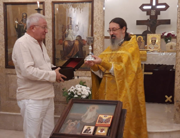 Со своей стороны И.П. Ткач приветствовал архимандрита Филиппа и передал в дар общине Русской Православной Церкви в Бейруте серебряную Евхаристическую чашу.