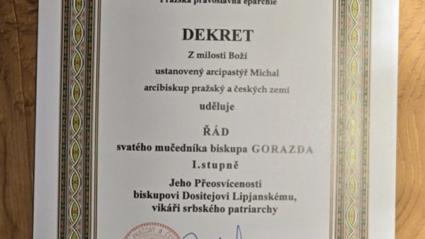 Његово Високопреосвештенство Архиепископ прашки и чешких земаља господин Михаил у знак захвалности доделио је у среду 4. септембра Његовом Преосвештенству Епископу липљанском господину Доситеју орден Светог Горазда првог степена.