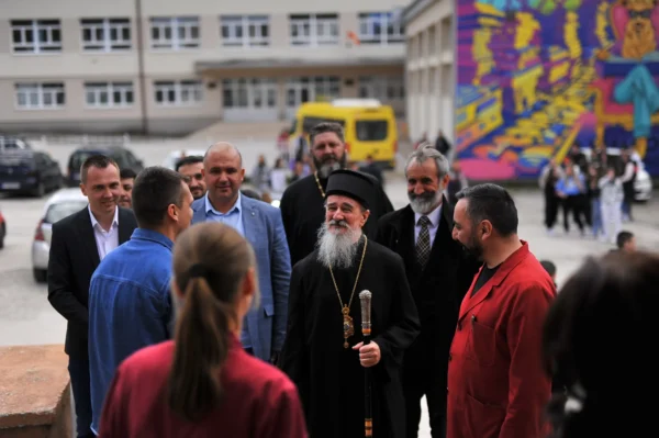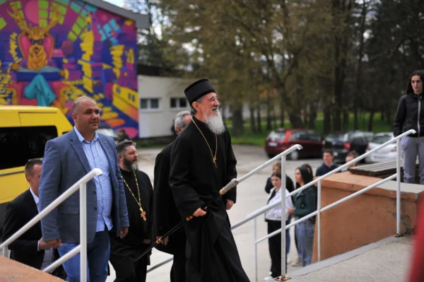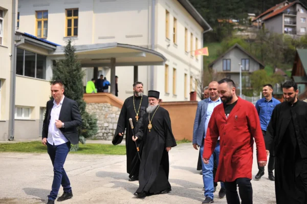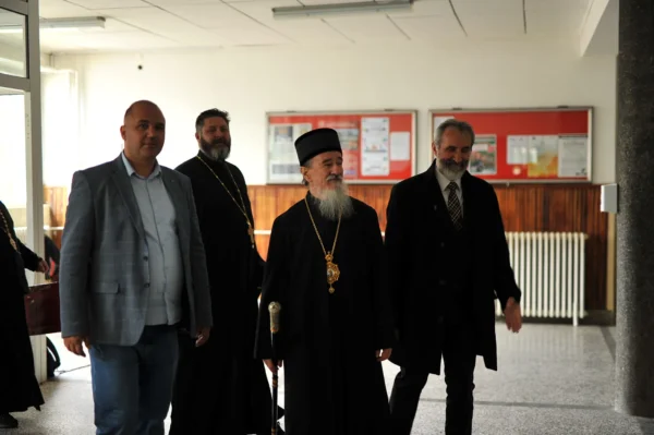 Након краћег пријатног и пријатељског разговора у општинској сали сви су се заједно упутили до Средње стручне школе Пљевља где их је дочекао директор мр Бојан Струњаш. Директор је захвалио Епископу Атанасију на његовој посети овој школској установи и указао да је ово, по његовим сазнањима, прва посета једног Епископа након више од 80 година, односно након Другог светског рата. Додао је да је ова школа саграђена највише даром и трудом манастира Свете Тројице и Рашко-призренске Митрополије којој су Пљевља тада припадала, као и многих Срба пљеваљског краја. Те далеке 1901. године у овој згради је почела са радом прва Српска гимназија у Пљевљима и у то време је била једна од 5 српских гимназија у тадашњем Отоманском царству.