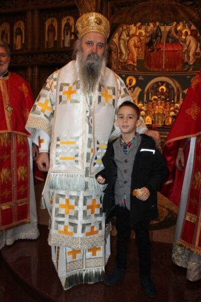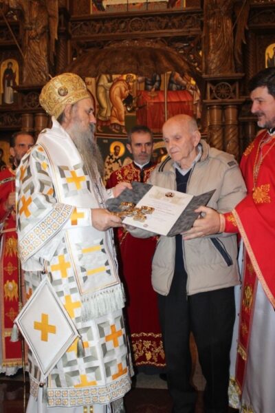 Након обраћања верницима, епископ Фотије је уручио Божићну грамату г. Радивоју Остојићу. “Радивоје је са нама годинама. Као појац је увијек ту, и кад је било народа и кад није и ово је наш начин да му се одужимо”, рекао је владика Фотије.