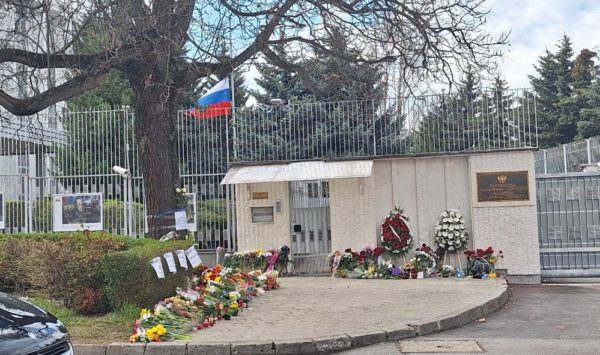 Жители Софии несут цветы к Русскому Подворью в память о жертвах теракта в «Крокус Сити Холле»