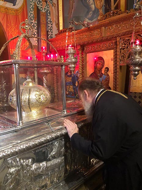 В заключительный день поездки архипастырь и сопровождающие его священнослужители и миряне совершили молитву у мощей великомученика Димитрия Солунского, Мироточивого в городе Фессалоники. В базилике великомученика Димитрия также пребывает рака с мощами мученицы Анисии Солунской.