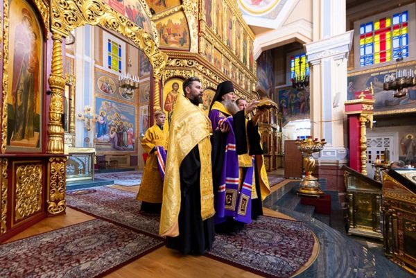 Его Высокопреосвященству сослужили: благочинный приходов Алма-Аты, настоятель Никольского собора митрофорный протоиерей Валерий Захаров, духовник Алма-Атинской епархии архимандрит Иоанн (Сазонов), ключарь Вознесенского кафедрального собора, руководитель отдела Митрополичьего округа по связям с общественностью протоиерей Александр Суворов, настоятель Богоявленского храма протоиерей Валерий Шаврин, протоиерей Александр Соколов, духовенство главного храма Южной столицы; диаконский чин возглавил руководитель службы протокола митрополита протодиакон Роман Головин.