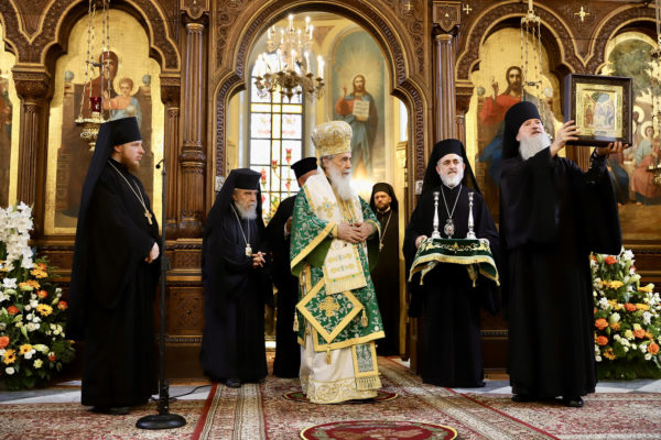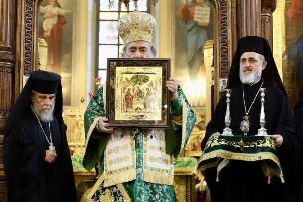 В ответном слове начальник Русской духовной миссии поблагодарил Блаженнейшего Патриарха Святого града Иерусалима и всей Палестины Феофила III за драгоценные и проникновенные слова и в память о богослужении в русском храме преподнес Предстоятелю Иерусалимской Церкви образ Пресвятой Троицы с частицей Мамврийского дуба.