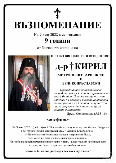 07/07/2022 07/07/2022 На 9 юли 2022 г. (събота) от 9:00 ч. ще бъде отслужена заупокойна св. Литургия в Митрополитския катедрален храм „Успение Богородично“ – Варна, от Варненския и Великопреславски митрополит Йоан в съслужение с духовници от епархията, след което в храма ще бъде извършена панихида. На гроба на приснопаметния митрополит Кирил, на централния гробищен парк в града,...