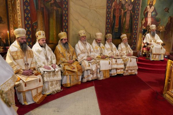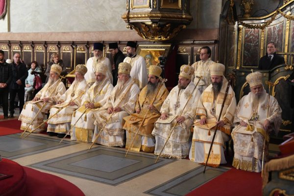Торжественом Литургијом је началствовао предстојатељ Српске Православне Цркве уз саслужење: високопреосвећене господе митрополита црногорско-приморског Јоаникија, врањског Пахомија, шумадијског Јована, милешевског Атанасија, нишког Арсенија, далматинског Никодима и будимљанско-никшићког Методија; и преосвећене господе епископа буеносајреског и јужно-централноамеричког Кирила, осечкопољског и барањског Херувима, шабачког Јеротеја, лондонског и великобританско-ирског Нектарија, ремезијанског Стефана, хвостанског Алексеја, новобрдског Илариона, топличког Петра и јенопољског Никона; уз молитвено учешће Високопресвећеног Митрополита браничевског г. Игнатија и преосвећене господе епископа липљанског Доситеја и моравичког Тихона.