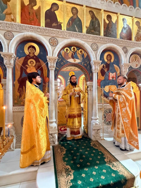 За Литургией архипастырю сослужили настоятель храма, секретарь Администрации приходов Московского Патриархата в Италии иеромонах Амвросий (Мацегора), иеромонах Кирилл (Порубаев) и секретарь председателя ОВЦС иерей Николай Васин.