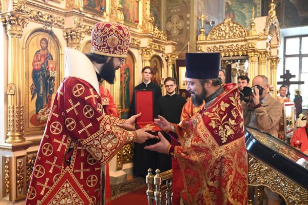 Настоятель храма обратился к архипастырю со словами благодарности за совершение Божественной литургии в этот праздничный для прихода день и преподнес владыке пасхальное яйцо.