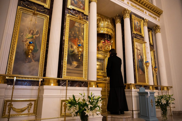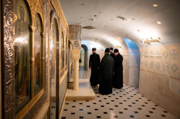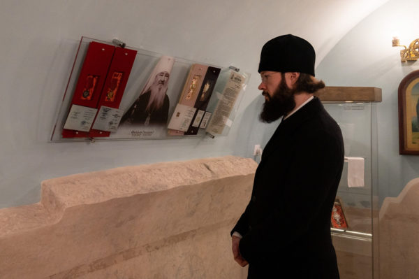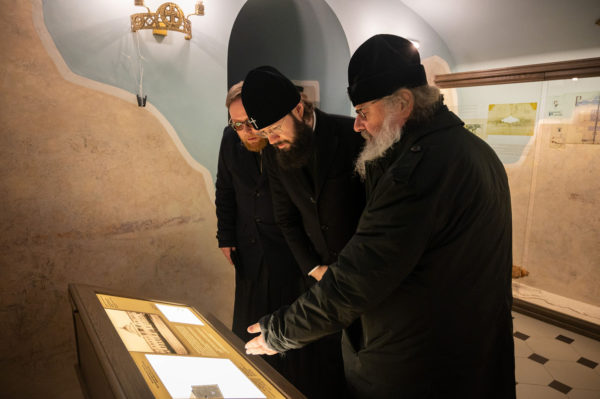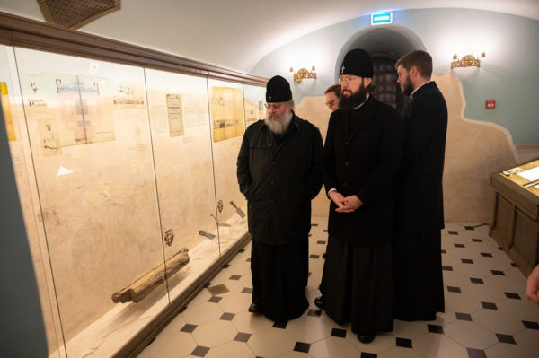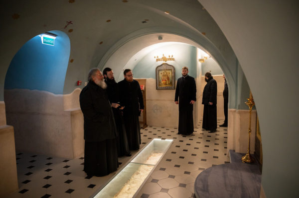 Митрополит Антоний посетил пещерный храм, освящённый в честь Рождества Пресвятой Богородицы. Здесь архипастырь поклонился месту обретения иконы Пресвятой Богородицы, осмотрел музейную экспозицию, посвящённую истории Казанского образа и Богородицкой обители, приложился к ковчегу с частицей мощей преподобномученицы великой княгини Елисаветы, которая при жизни имела попечение о благоукрашении пещерной церкви.