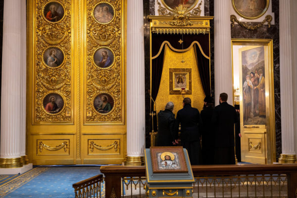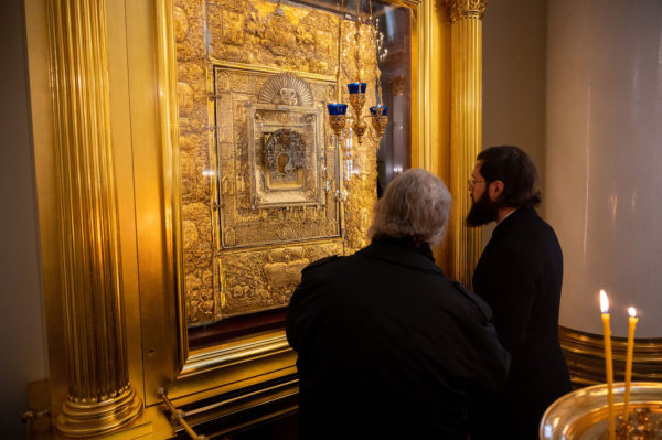 В верхнем храме архипастыри приложились к почитаемому древнему списку Казанской иконы Божией Матери и ризе, украшавшей первоявленный образ Пресвятой Богородицы.