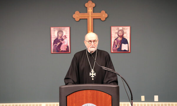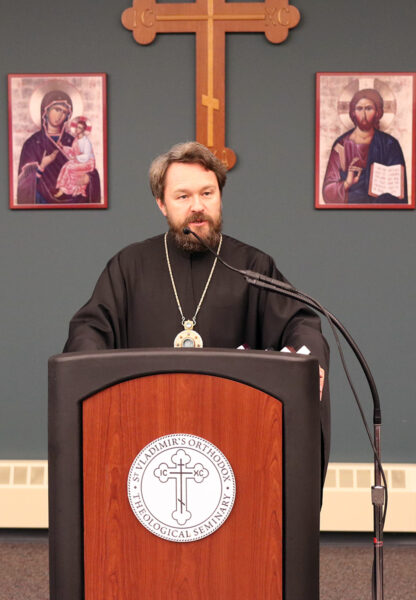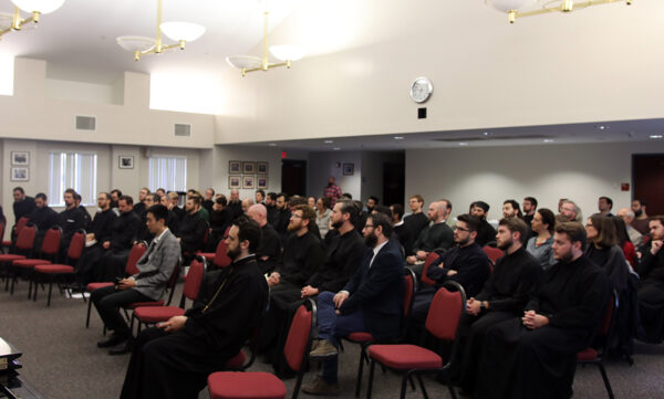 В актовом зале состоялась встреча митрополита Волоколамского Илариона с преподавателями и учащимися Свято-Владимирской семинарии. Представляя высокого гостя, протоиерей Чад Хатфилд напомнил, что с 2014 года митрополит Иларион является почетным доктором богословия Свято-Владимирской духовной семинарии и широко известен как богослов, церковный историк и композитор.