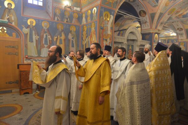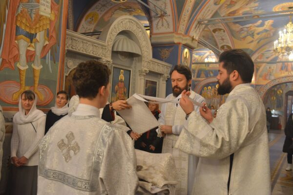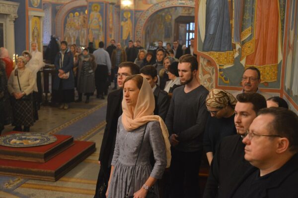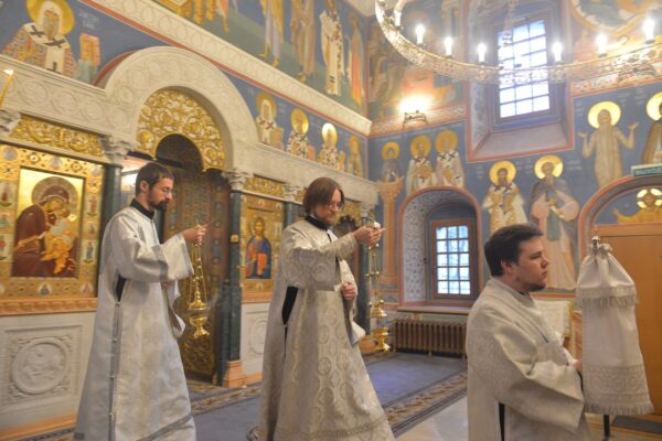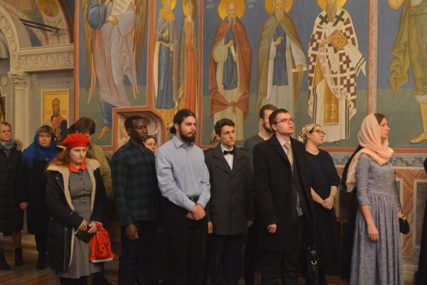 Архипастырю сослужили проректор по учебной работе ОЦАД иеромонах Павел (Черкасов), заместитель заведующего кафедрой теологии Национального исследовательского ядерного университета «МИФИ» иеромонах Родион (Ларионов), сотрудники и учащиеся ОЦАД в священном сане.