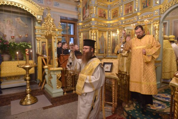 По окончании Литургии настоятель храма архимандрит Серафим (Шемятовский) обратился к митрополиту Илариону со словами приветствия.