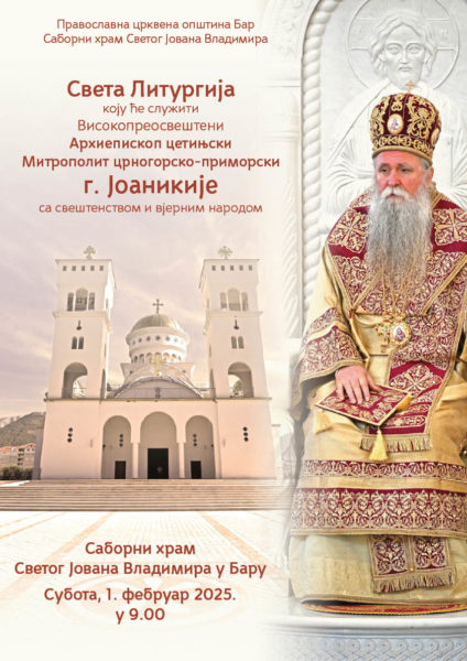 Његово високопреосвештенство Архиепископ цетињски Митрополит црногорско-приморски г. Јоаникије у суботу, 1. фебруара, служиће са свештенством и вјерним народом Свету архијерејску литургију у Саборном храму Светог Јована Владимира у Бару, са почетком у 9 часова.