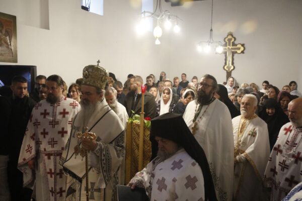 У капели Светог Трифуна архијерејска Литургија. Владици Теодосију је с једне стране у олтару саслуживао архимандрит Јован Радосављевић, који је превалио деведесету и стигао из манастира Горње Жапско код Врања, а с друге архимандрит Нектарије Серфес допутовао из Америке, у још једну хуманитарну мисију на Космет. Игуман манастира Савине Макарије и игумани Зочишта и Св. Архангела, оци Стефан и Михајло, као и пароси великохочански Миленко и ораховачки Веља, и још пар свештенослужитеља увеличало је ово литургијско сабрање.