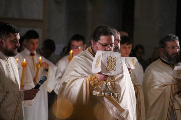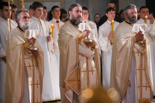 Љубав гради литургијску заједницу и у тој литургијској заједници смо сједињени са Господом, који је Син Божји и који је у љубави са Богом Оцем. Господ нас, дакле, у тој заједници приводи Оцу, те тако и ми за Бога Оца постајемо драгоцени, постајемо непоновљиве личности, само због тога што Господ Бог Отац воли Сина свога и Син воли Оца и воли нас. То је као када волите некога, па вам неко да једну безначајну ствар. Та ствар је за вас велика, драгоцена и душа вас боли кад је изгубите. Али она није сама по себи то. Она је то због тога што је ушла у једну љубавну заједницу. И управо то је све што приносимо овде – у ову љубавну заједницу литургијску, преко Господа нашег који је служитељ Богу Оцу. Све то постоје драгоцено, постаје исто као и Син Божји, дакле, обожује се. И то је оно велико чудо које се збива са свима нама који смо чланови литургијске заједнице, али, рекох, то можемо разумети једино ако имамо љубави према Господу. И како каже апостол Павле, све ће проћи, знање ће проћи, вера ће проћи, али љубав остаје, зато што је љубав основ и начин постојања нашег, јер тако и Бог постоји, јер Бог је љубав. Нека нас Господ удостоји Царства свога небескога сада и увек и у векове векова. Христос васкрсе!
